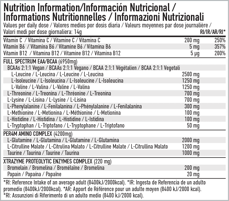 EAA XTRA is a zero sugar, full-spectrum essential amino acid formula delivering over 11g of aminos per serving—including 5g BCAAs—plus added glutamine, vegan enzymes, taurine, and vitamin C to support recovery, gut health, hydration, and immune function.